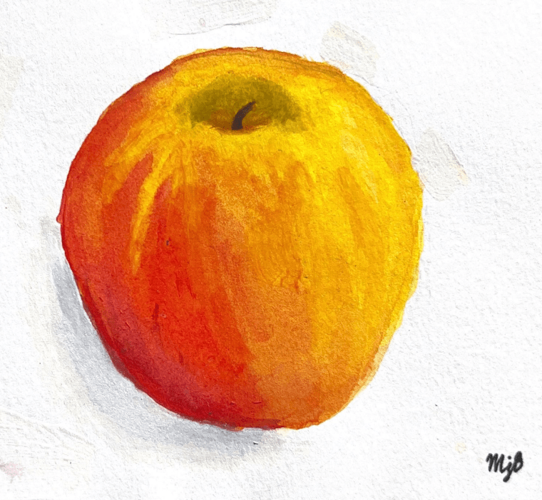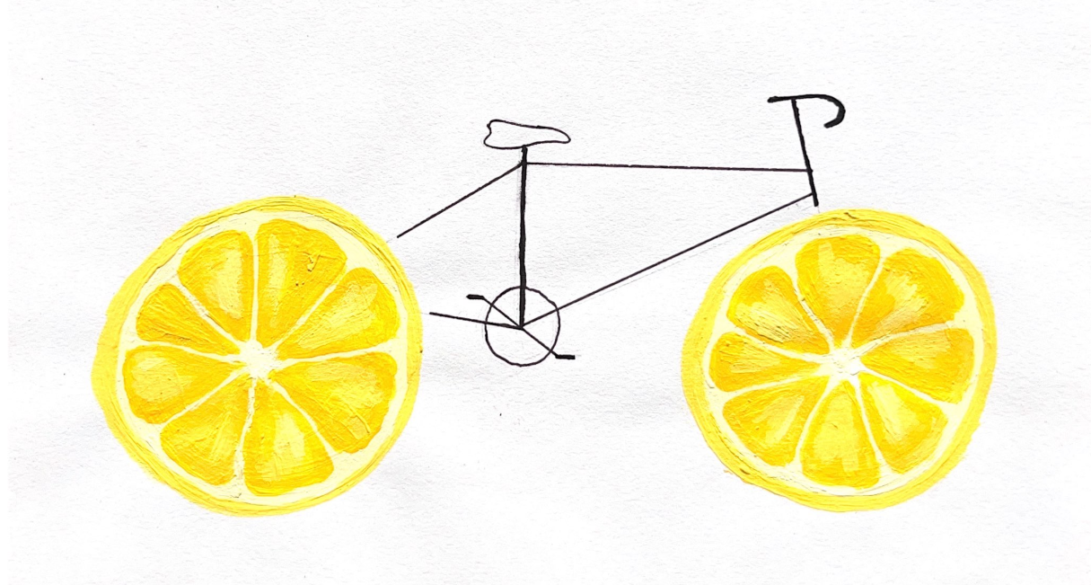 The details of naturally occurring, very colorful subjects were fun to explore with acrylic paint. The details of the apple were a good application of acrylic paint as layers can be applied without disrupting previous layers. The lemon bike was a good learning experience for proportions and details within a similar color range.